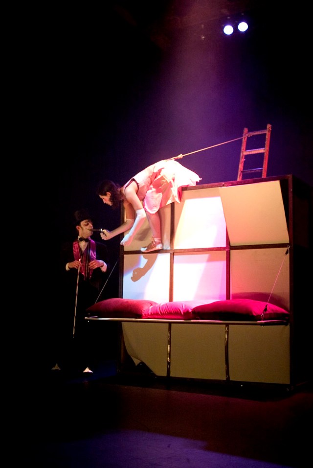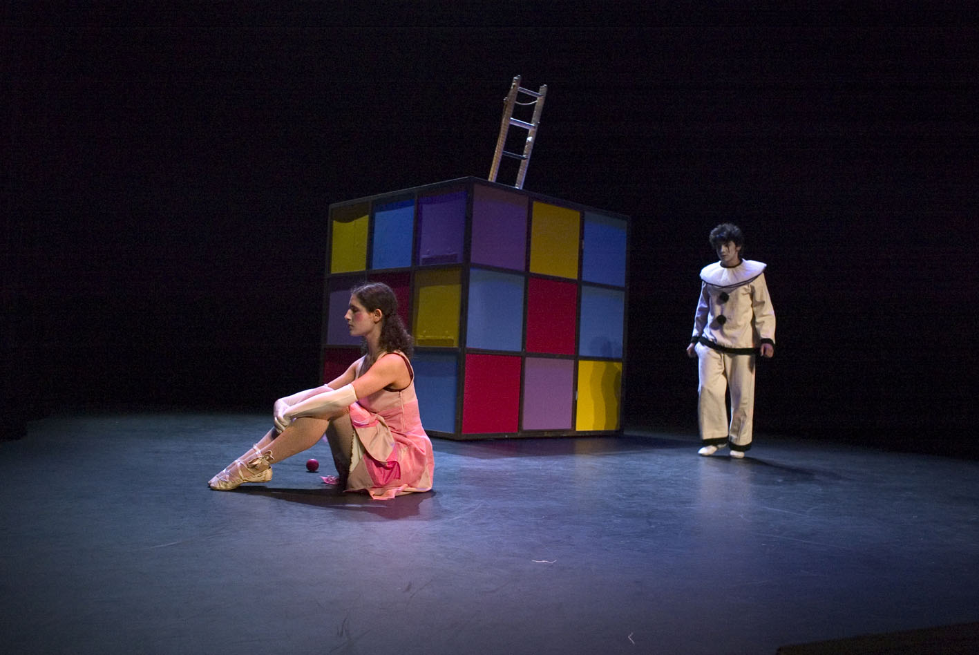 Mettre ça entre les pattes de tout petits était ambitieux, et supposait des moyens idoines. Damien Gandolfo a choisi une voie originale, faisant la part belle au visuel et au son. Ici pas de texte. La narration se joue dans le geste, la danse et la pantomime. Un dispositif scénique simple, efficace, régit la chorégraphie et tous les déplacements, par un centre affirmé, exploité judicieusement : un rubik’s-cube surdimensionné accueille toutes les entrées et sorties, les acrobaties et les projections video. A la fois boîte à malice et théâtre à Guignol, cet élément prépondérant de la mise en scène est une réponse maligne à la tension chorégraphique et au rythme ouvert de la proposition scénique. Autour de celui-ci évoluent les comédiens-danseurs qui incarnent les deux héros de Soldat, ainsi que leur ombre tutélaire : le soldat, la poupée son amoureuse, et le diablotin, ici rendu en une sorte de méphisto inquiétant, proche d’un djinn de nos contes orientaux.