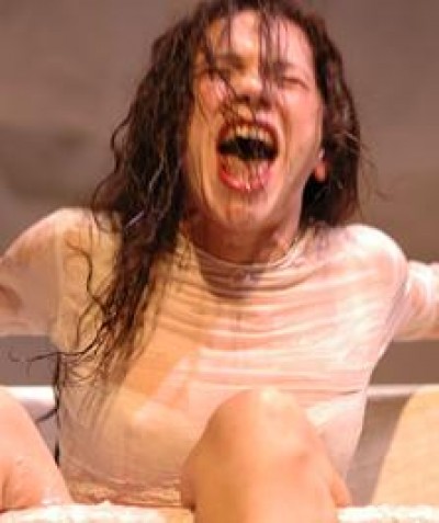 Ariane d’Auble est dans son bain. Autour de sa baignoire il n’y a rien, sinon des draps blancs, aussi blancs que les draps de bain sur lesquels est assis le public à qui elle s’adresse. L’eau dans laquelle elle se plaît tant est sa compagne sur scène.