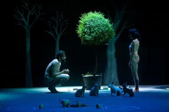 Dans ce Maldito, son univers est immédiatement là, parfaitement identifiable. Au plateau, d’emblée cette appropriation de l’espace qui lui est si particulière, et que l’on avait goûtée dans La Casa. Quelques objets épars, surréalistes, comme ces lapins ou ces arbres de cour d’école, un fauteuil voluptueux, bref quelques éléments simples qui tout de suite signent la manière Liddell.