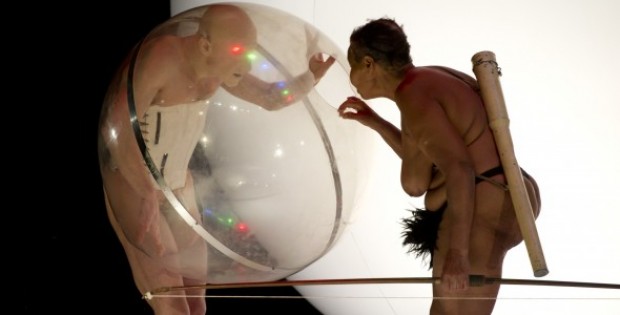 Dommage, donc, car ce « Berceau de l’humanité » non seulement part d’une bonne idée, mais à priori présentait toutes les garanties d’une bonne pièce : un thème plutôt engagé, un bel espace scénographié, un soin tout particulier apporté à l’aspect visuel, et la présence au plateau de deux personnages tout à fait extraordinaires, le performer lunaire Steven Cohen dont on aime habituellement sans réserve le travail, et cette dame âgée vraiment charismatique, poignante dans sa nudité pudique.