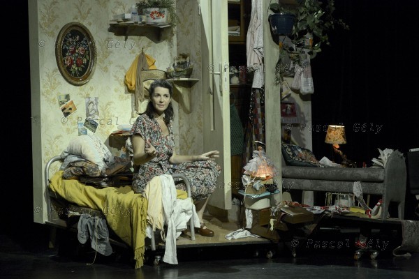 Dans un petit salon sale et encombré, des objets hétéroclites créent instantanément l’ambiance. La narratrice habite seule avec sa mère, malade, un peu folle. Un huissier sonne, on vient les saisir. Dans un accès de colère, profondément perturbée par ses souvenirs de guerre, la mère va peu à peu nous livrer son passé, mélangeant époques et personnages, interpellant le Maréchal « Putain » et traitant l’huissier de collabo, béret vissé sur la tête tel le milicien Darnand…