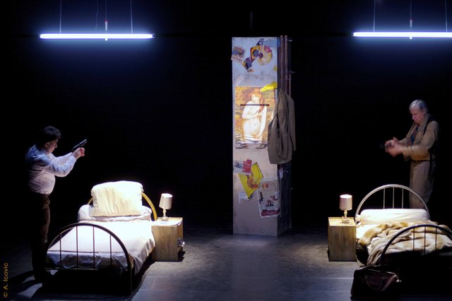Christophe Gand prend le parti de faire jouer Ben et Gus par deux acteurs d’un certain âge, comme un vieux couple, à la « Je t’aime moi non plus ». Leur train-train de tueurs à gages, les petites querelles, les souvenirs flous de contrats passés fonctionnent. La tension montante entre les deux hommes, l’absurde de la situation par les dialogues de Pinter nous conduisent vers ce tragique dénouement et nous démontrent ce pouvoir invisible, implacable et déshumanisé.