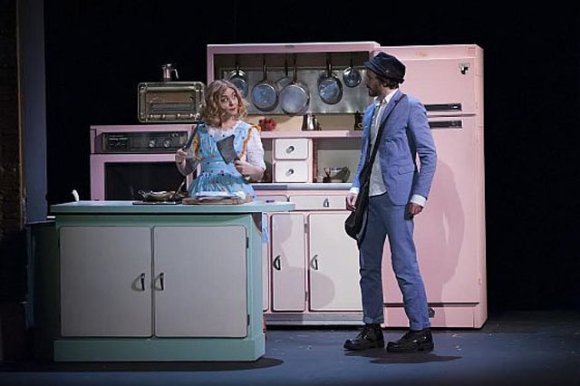 La cuisinière Clotide Morgiève au sourire angélique omniprésent prépare le repas à une extrémité du plateau dans une cuisine aux couleurs acidulées très années 50. A l’autre extrémité, deux musiciens Medhi Bourayou et Laurent Guillet agrémentent le ton de la pièce d’une guitare, synthétiseur et cymbales, sans aucunes expressions du visage, tels des « croque-morts » tandis qu’au centre, le narrateur J.C. Dollé joue tous les rôles masculins, du plus jeune au plus ancien, amis ou ennemis de la victime.