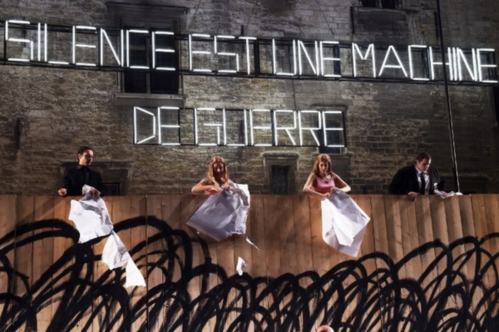 Sur l’immense plateau de la Cour d’Honneur, sous l’inscription lumineuse – à la Claude Lévêque – qui en lettres de feu annonce « TON SILENCE EST UNE MACHINE DE GUERRE », un praticable flanqué d’escaliers et portant des graffiti, une armoire, une table de maquillage, un lit (pouvant servir aux fornications) et une autre table sans oublier un piano où, en direct, Damien Lehman interprétera des musiques de Frédéric Chopin, de Salvatore Sciarrino et de Philippe Hersant entre autres.