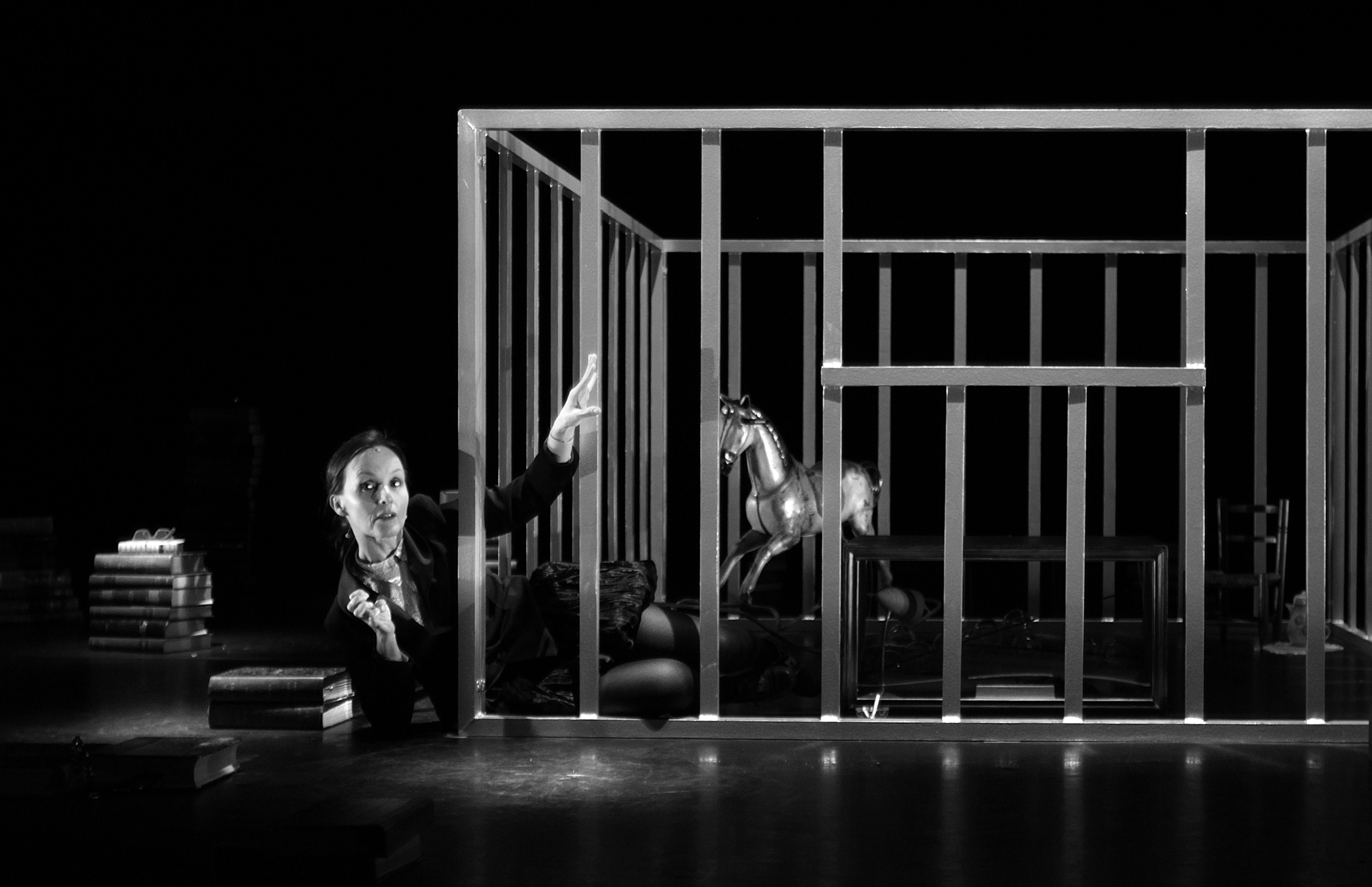 Près d’un siècle plus tard, l’adaptation théâtrale de cet essai fondateur propose une scénographie et une mise en scène qui fonctionnent comme une mise en abyme de cet état de dépendance infantile dans lequel la femme était cantonnée. Au milieu d’une estrade qui se révèle vite être – dès que la lumière s’intensifie – un parc (géant) pour bébé, entourée d’une petite chaise dans un coin, d’un cheval à bascule et d’autres jouets d’enfants de l’époque victorienne, l’actrice débute une conférence sur les femmes et l’écriture romanesque. Cette conférence, donnée par Virginia Wolf dans des Collèges féminins de l’Université de Cambridge, démonte les mécanismes d’exclusion à l’œuvre : si l’on naît femme, on ne peut prétendre à être écrivaine. Au travers de sa réflexion, c’est le sort de toutes les femmes, présentes et passées, qui va être projeté.