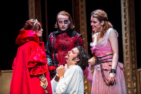 La scénographie de Camille Ansquer et la mise en scène imaginée par Daniel Mesguich sont assez « magiques », dans toutes les acceptions du terme. Au niveau esthétique d’abord, chaque détail est « merveilleusement » étudié. Ainsi les murs du palais, lieu des intrigues, sont de miroirs sans tain qui laissent apparaître la princesse espionnant les scènes en jeu. De même ces éclairs qui traversent le plateau en illuminant ou en plongeant dans l’obscurité les allées et venues des intrigants participent de l’atmosphère féérique. Quant aux costumes (de Dominique Louis) et aux maquillages (fort expressifs, d’Eva Bouillaut), ils sont là pour souligner la noirceur des uns ou encore la noblesse et la beauté des autres. Les qualités plastiques de l’univers ainsi créé participent pleinement à la fête des sens tout comme le jeu sans faille des acteurs (William Mesguich, Alexandre Levasseur, Grégory Corre, Sarah Mesguich, Sterenn Guirriec, Rebecca Stella et Alexis Consolato), excellents et remarquablement dirigés.