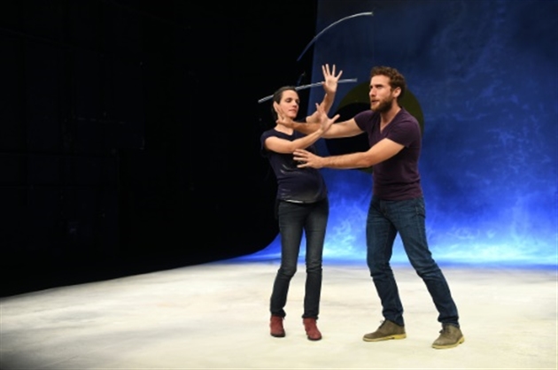 En effet, abandonnant toute tentation de vouloir retranscrire l’ensemble de cette épopée, Tiago Rodrigues – qui a claqué très jeune la porte des institutions officielles artistiques pour rejoindre le collectif belge tg STAN, connu pour ériger la liberté comme moteur de sa création – en « irresponsable » inspiré va extraire le suc de cette odyssée pour en restituer l’essence poétique. Le dispositif (qui évoluera au cours de ces neuf « chants » pour redevenir à la fin ce qu’il était au commencement) revêt la pureté des origines : Chacun va tour à tour nommer l’autre – António prononce la femme en désignant l’homme, et l’homme reprend Cleópatra, en la montrant – chacun, ensuite, les bras et mains tendus, créant l’histoire de l’autre, ce qu’il fait, ce qu’il voit, ce qu’il pense. Sans jamais se toucher ni même s’effleurer, leur manière de se nommer, infiniment sensuelle, résonne comme s’ils faisaient l’amour devant nous sur le plateau.