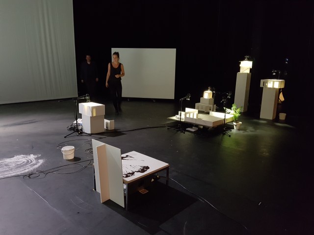 Steve conçoit et dispose les éléments des maquettes, règle les éclairages ou déverse des matériaux que Charlotte fige sous forme de photographies live projetées sur le grand écran de fond de scène.