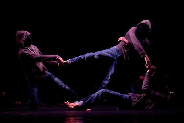 Pas d’ombre portée car le noir est absolu. Seul un fond sonore angoissant (création originale de Christophe Ruetsch), tel un bruit résiduel, va crescendo et saisit un public en suspens. Jusqu’à l’entrée en matière de la lumière faisant basculer au plateau le public et ces trois silhouettes « échouées ». Vêtues d’un jean, pull à capuche et d’un voile occultant leur visage; symbole d’identité première, elles exploitent cette figure « vide », creux identitaire, sous différents prismes. Pour se faire le plateau est cerné au sol d’un rectangle révélant un espace d’exposition, un laboratoire humain. L’inertie fait place progressivement à leur activation, elles entrent en communication. Au sol, elles se répondent par secousses, se débattent et se désarticulent jusqu’au temps du mime, rythmé par une gestuelle parfaitement synchronisée, laissant entrevoir l’accord…