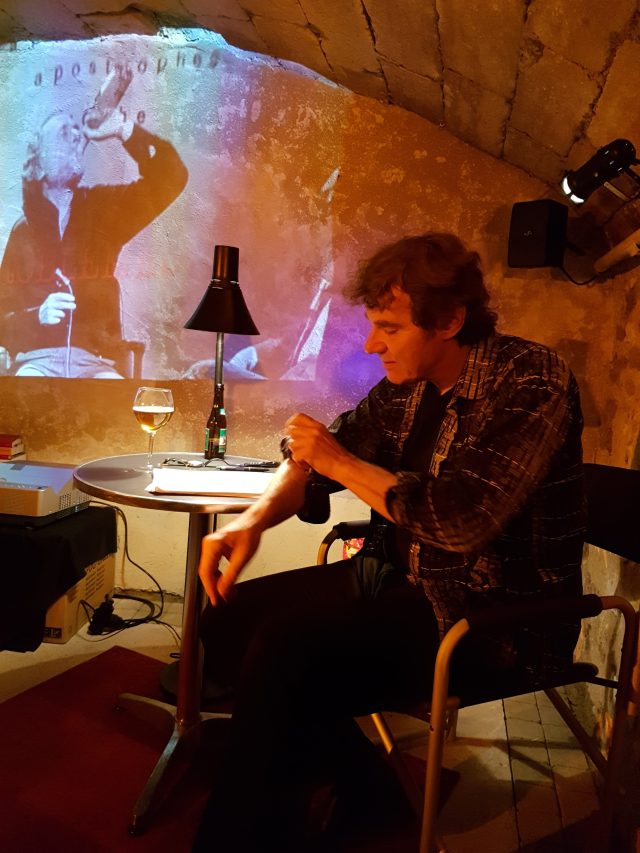 Dans son laboratoire artistique situé dans la cave (lieu évoquant « Les Carnets du sous-sol ») des Ateliers d’Amphoux (nom évoquant phonétiquement « Les Contes de la folie ordinaire »), un personnage sorti tout droit d’une photocopieuse 3D ayant dupliqué un avatar contemporain du poète iconoclaste s’affaire derrière une petite table. Il est tout entier absorbé par les notes de ses tapuscrits qu’il parcourt en tous sens. Canettes de bière écrabouillées, bouteille de vin trônant en bonne place, verre rempli d’une abondante mousse, papiers froissés au sol, l’illusion d’entrer de plain-pied dans l’univers de Charles Bukowski est créée bien avant qu’il n’ouvre la bouche. En effet l’acteur, « qui a un auteur dans le corps », vit comme son modèle au travers de l’écriture, et ce ne sont pas ces quelques quidams prenant place autour de lui qui vont le détourner de l’essentiel : la poésie tramant l’existence plus que les excès de boisson ou autres qui s’attachent à une réputation sulfureuse.