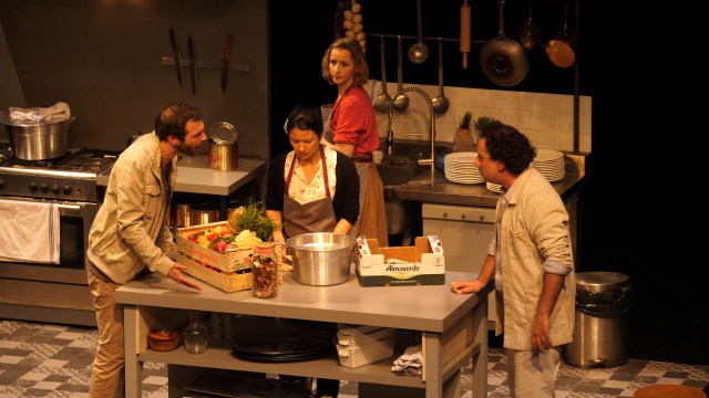Fabio Gorgolini et Ciro Cesarano réalisent le tour de force de conserver le message du dramaturge sicilien en le mâtinant de contemporanéité et de rocambolesque. Les cinq comédiens nous emportent avec une folle vitalité dans leurs activités culinaires pour lesquelles le temps est compté. Sur scène, un décor réaliste d’une vraie cuisine de restaurant : ses feux, four, évier, tables de découpe et de préparation, rangement, ustensiles, vestiaire et l’incontournable double porte battante. Tout y est. Les acteurs vont évoluer dans cet espace, cuisiner, nettoyer, travailler avec effervescence. L’ambiance nous transporte de l’autre côté des Alpes où la chaleur de l’accent latin et la gaieté apparente tranche avec la gravité du propos.