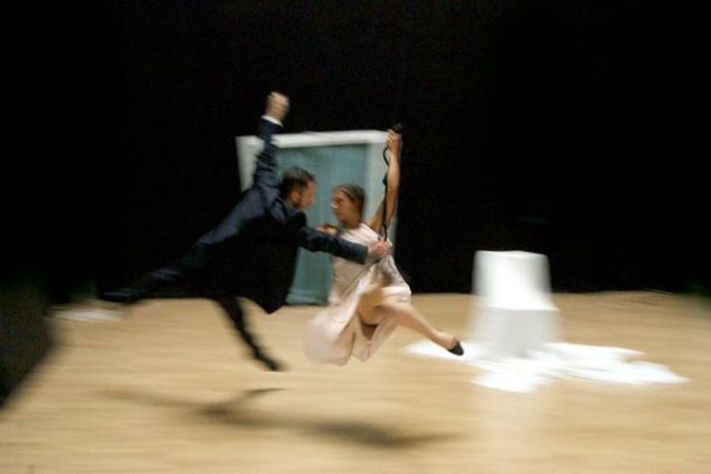 Un robe qui virevolte, un portant mobile qui occupe la scène, prêt à tout avaler, un fauteuil animé et curieux, et le personnage en quête d’absolu, toujours à l’affût de quelque chose.