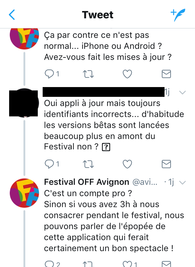Chers Président et bureau d’AF&C, vous n’êtes pas sans savoir que l’année prochaine aura lieu un autre Off d’Avignon, vraisemblablement dans la même fourchette de dates. Il nous semble que si vous désirez proposer une application en temps et heure, et en ordre de fonctionnement, aux milliers d’utilisateurs potentiels, vous pouvez, vous devez, vous y prendre un peu à l’avance. Demander à vos correspondants réseaux sociaux de faire une petite enquête pour simplement tenir compte et répercuter les quelques désirs d’amélioration des fonctions indispensables qu’il ne faut pas éliminer d’année en année, afin d’offrir à vos utilisateurs l’édition prochaine un service véritablement digne d’un Off qui, avec ses 1538 spectacles, devient impossible à gérer pour un spectateur Lambda. (Comme avec ce pavé (pas affiné) qu’est le « programme » papier du Off).