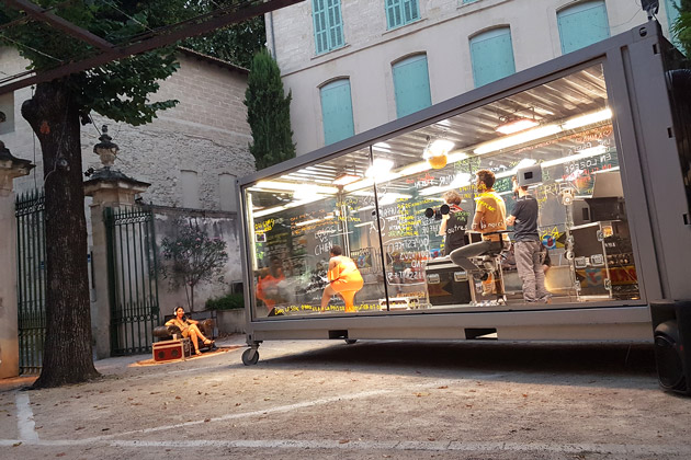C’est donc sous des voiles d’ombrage et dans la cour du Musée Angladon, que le metteur en scène a installé son espace petit déjeuner. Au centre les deux comédiennes s’activent avant l’arrivée des spectateurs, une petite trentaine, qui se retrouvent vite un peu entassés autour d’elles alors que celles-ci leur servent un café ou un thé. Les explications et les tirades s’enchaînent entre deux biscottes et une tranche de jambon. Le public bon enfant sourit, rigole. Les plus gênés par la proximité et par l’interactivité demandée parfois par les comédiennes, se tassent au fond de leur tabouret. C’est donc sous une chaleur écrasante et sous un fond sonore abrutissant dû aux tests son de la régie du Festival dans les jardins Ceccano à une trentaine de mètres que ce petit déjeuner littéraire se poursuit. Les textes s’enchaînent rapidement, trop rapidement, et les comédiennes passent du coq à l’âne sans aucun répit. A trop s’attacher à la forme le metteur en scène Charlie Windelschmidt a oublié le fond et le public, lui, reste désespérément sur sa faim de théâtre.