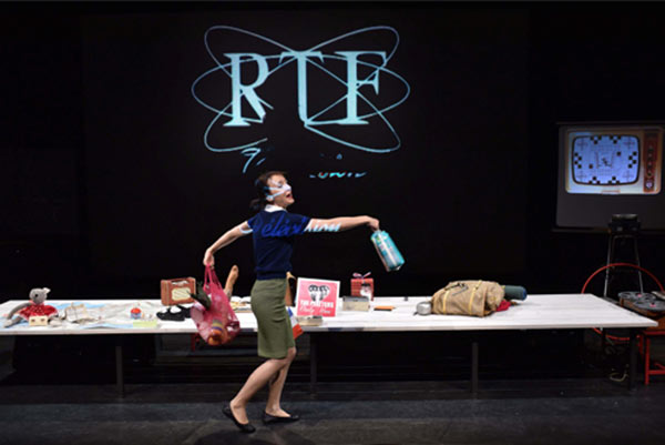 Un projecteur diapo, un magnétoscope, deux écrans, des boîtes où s’empilent pêle-mêle photos, cahiers et livres, un tableau noir sur trépied, font office de lanternes magiques éclairant le retour sur images. .. Projeté sur écran, le portrait d’un angelot assis nu, rouleau au-dessus de la tête, dans l’attitude étudiée des photos d’après-guerre. Puis, exhumée du carton, une première photo sépia datant de 1943. On y voit une fillette de trois ans, barrettes pour retenir les cheveux, qui pose appliquée devant l’œil du photographe. Deux autres clichés avec deux autres petites filles prenant la pose, un an après, ceintes dans leur robe à manche ballon. Sur tous ces clichés on l’aura compris, c’est la même enfant, Annie Ernaux petite. Les souvenirs affluent … Les jours de fête, jours de lenteur de repas dominicaux qui s’étirent jusqu’à l’ennui avec en fond la voix des convives. Images sonores du grondement des V2, de l’arrivée des Allemands, de la femme tondue exhibée, de la paysanne qui lâche un magnifique pet au passage de l’occupant assorti d’un commentaire bien senti – « si on peut rien leur dire, au moins qu’on leur fasse sentir… ». D’autres souvenirs écrans viennent s’inviter, y compris ceux en creux de l’absence dans les conversations familiales de toute allusion au sort réservé aux enfants juifs ou aux camps d’extermination dont le monde « découvrait » alors l’existence. Et puis sans transition – le rythme échevelé l’impose – le tube de la libération « Ah ! Le petit vin blanc / Qu’on boit sous les tonnelles / Quand les filles sont belles / Du côté de Nogent », entonné en chœur par les deux conteurs en goguette et valsé avec entrain.