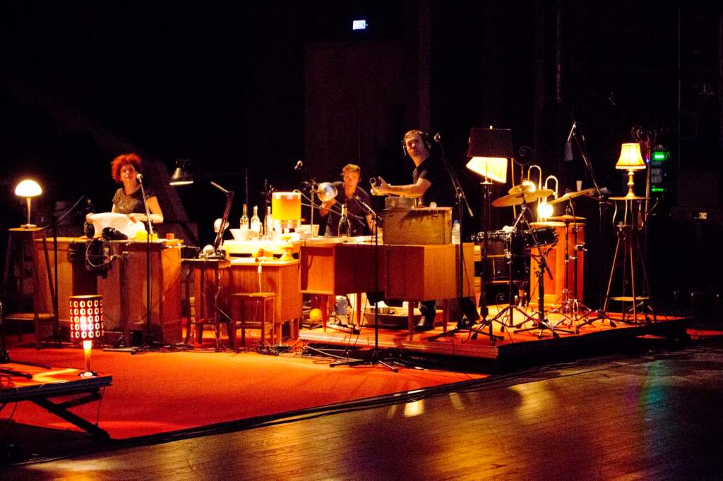 La scène est largement occupée par des instruments de musiques, micros, tables, et accessoires de bruitage, tandis qu’un écran surmonte le plateau. Les cinq artistes se répartissent autour des instruments et se déploient dans un ballet millimétré pour donner vie au film dans un doublage parfait, tout en assurant l’ambiance sonore. Pour que l’histoire se tienne, les protagonistes principaux sont des stars hollywoodiennes qui ont joué dans plusieurs films : Michael Douglas, Silvester Stallone, Julia Roberts, Sean Penn, Judy Dench… Les collages de films différents reflètent des époques et des coiffures diverses mais qu’à cela ne tienne, les répliques inventent une cohérence, le rythme emporte tout et le dispositif fonctionne parfaitement. L’intrigue est suivie, les séquences d’actions pimentent l’ensemble et tout passe. L’exagération est de mise, les rapprochements de films dissemblables et/ou connus font sourire. Les répliques sont hilarantes (voir la manière dont l’ordre de la ministre est déformé à chaque étape de communication).