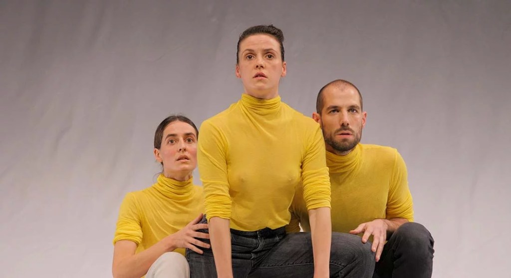 Trois interprètes, tee-shirt jaunes aux torses, quasiment immobiles, visages suspendus dans l’expression figée d’une incrédulité constante, se mettent à parler, lèvres entrouvertes, voix naturelles, ventriloques surprenants au talent indéniable. D’emblée, le décalage entre les traits figés qu’ils affichent et leurs paroles décontractées les rend indéniablement amusants. Ce comique se poursuit par une rupture assumée du 4ème mur : les trois trublions, écarquillés, se mettent à nommer les personnes présentes dans la salle, dont moi, commentent les tenues vestimentaires, devinent des âges, souhaitent des anniversaires : sans jamais remuer. Cela ressemble à un exercice d’improvisation, à des rires de gargouilles, à un deux trois soleil, à des jeux d’enfants où le collectif prime dans le travail de déformation du sens et des formes.