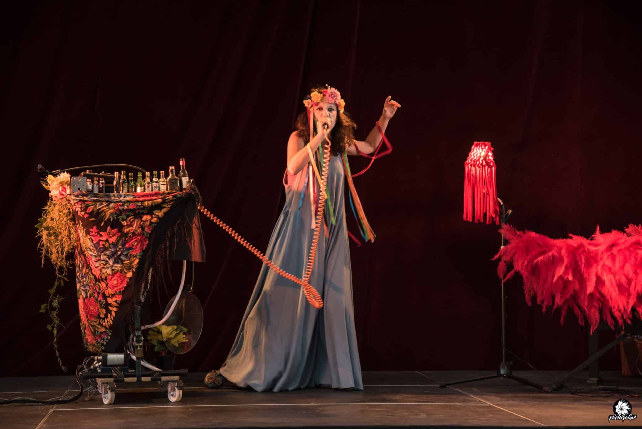 Démarrage dans le noir total. Nous passerons sur l’introduction pour ne pas gâcher la surprise des prochains spectateurs. Le personnage de Jubilä se présente comme une illuminée, couronne de fleur sur la tête, robe de hippie. Une table trône sur scène avec une série de mignonettes rangée par ordre de taille. Une console attend sagement derrière, de même que d’autres accessoires de plume. Quel univers fantasque ! Les adresses au public sont étranges et décalées. Au cours du spectacle, Jubilä change aussi de costume, passe une perruque rouge avec un drôle de peignoir translucide bleu. Elle brouille les pistes, s’engage sans cesse sur de nouvelles voies inattendues.