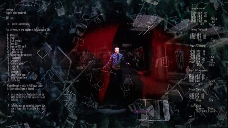 Le protagoniste de l’histoire est derrière un grand voile blanc qui occupe tout le bord de scène, où les premières projections apparaissent. Le reste de la scène sera le support visuel immersif que le vidéaste Paulo Carreira a méticuleusement reconstitué, afin d’immerger le public dans une réalité virtuelle surprenante. Dans une cabine surélevée, en dehors de la scène, O’Brien interroge Smith suspendu par des chaînes et torturé à coup de taser lorsque ses réponses ne sont pas conformes à sa rééducation cérébrale.