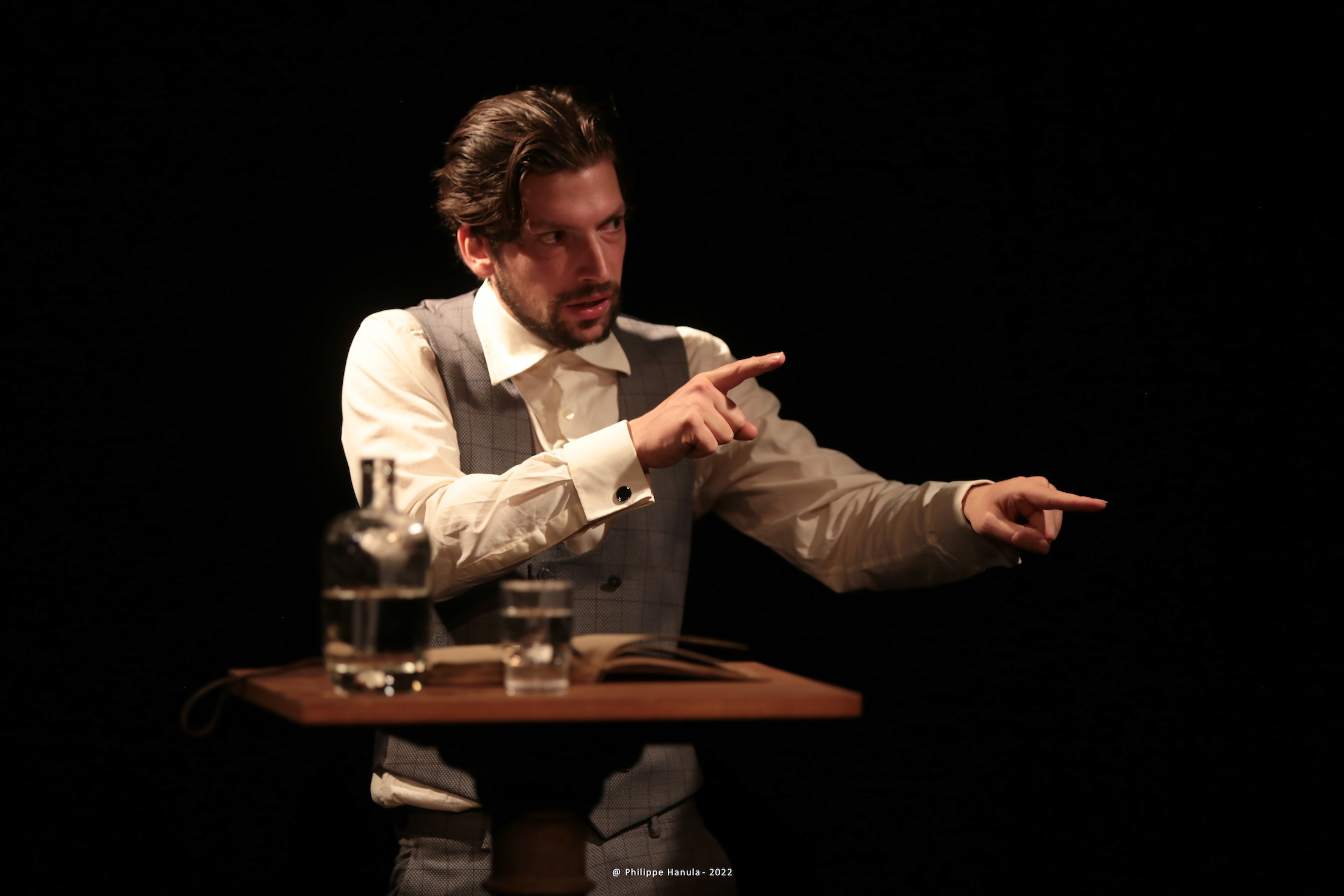 Cédric Daniélo arrive par la porte des spectateurs dans un beau costume trois pièces gris souris, comme ceux que l’on peut voir à Wall Street dans les années 1850 qui est la période où Melville écrit ce texte pour le Putnam’s Monthly Magazine.