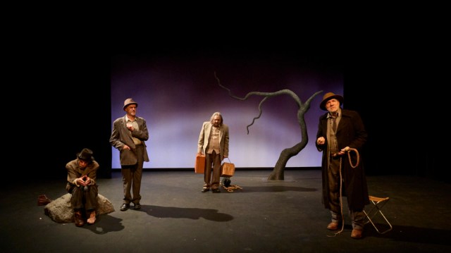 Sur scène Jacques Osinski est allé à l’essentiel, un vieil arbre décharné et un rocher font office de décor. Nous découvrons Estragon et Vladimir, l’un sur sa pierre, l’autre droit comme l’arbre. Beckett ancre son théâtre absurde dans une réalité charnelle et tout est là, tout apparaît en quelques secondes, le minéral, le végétal, l’animal et la souffrance d’un Estragon souffrant abominablement de ses pieds. L’époque est indéfinie, comme souvent chez Beckett, le corps est important et ce corps omniprésent est formidablement incarné par un Denis Lavant au sommet de son art, ami de toujours de Jacques Osinski. Denis Lavant semble toujours avec plus d’évidence fait pour ce type de rôle, l’absurde et le destin lui vont à merveille mais cet indéniable talent lui permet aussi de ne pas occulter celui de ses compagnons de scène Jacques Bonnaffé (Vladimir), Jean-François Lapalus (Lucky), et Aurélien Recoing (Pozzo). Ces quatre comédiens sous la houlette de Jacques Osinski nous offrent tout ce que l’on peut espérer d’un Beckett, l’absurde, l’humour noir, cette impression de spirale qui entraîne le spectateur dans cette histoire sans fin.