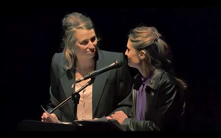 Ces trois femmes, les demi-sœurs et la mère de la plus âgée, sont réunies sur scène, par l’intermédiaire d’une sociologue qui mène une recherche sur les effets de la filiation non reconnue. Un pupitre au centre du plateau, sur lequel la conférencière s’exprime, lisant quelques lettres, exposant le déroulement du procès et précisant le cadre temporel. De chaque côté, deux espaces distincts, comme la séparation imposée par le père à ses deux filles.